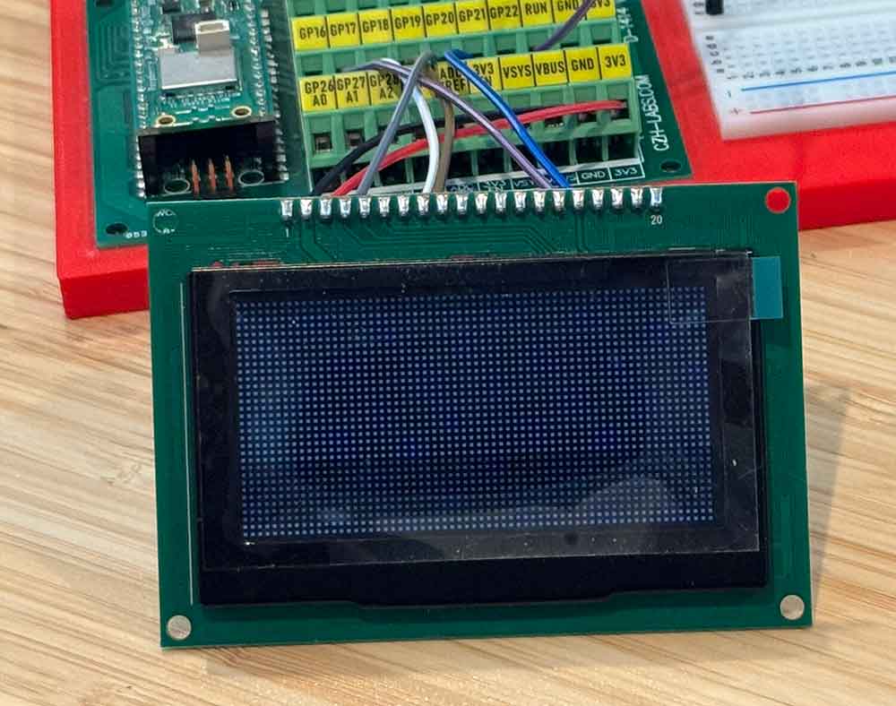 Our goal here is just to get the Pico sending SPI data out to to the OLED screen and displaying it. The screen uses a SSD1305 chip to read in SPI or I2C data and output it to the OLED display. We will use SPI, with the following pins: