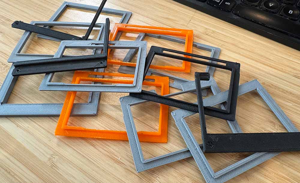 While the new OLED display physically fits into the TI-86 chassis, it is going to need some kind of retainer around it for ideal positioning. This is a pretty simple matter with CAD and a 3D printer, but the devil is definitely in the details. Here is the stack of attempts as we iterated toward perfection: