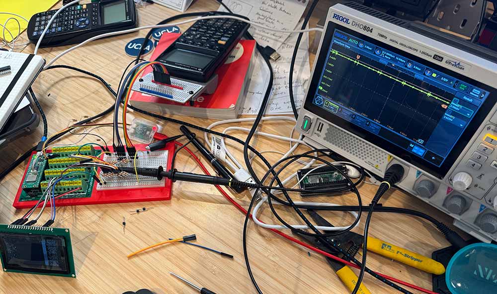 I’m not going to dwell on this step here, since everything will be documented in the code when I get it uploaded to Github. Suffice it to say, this was probably the hardest part of the project. The display chip has a very specific format and will display garbage, or nothing at all, if you get it wrong. This was the point that the big oscilloscope came out. It was also the peak mess on my workbench.