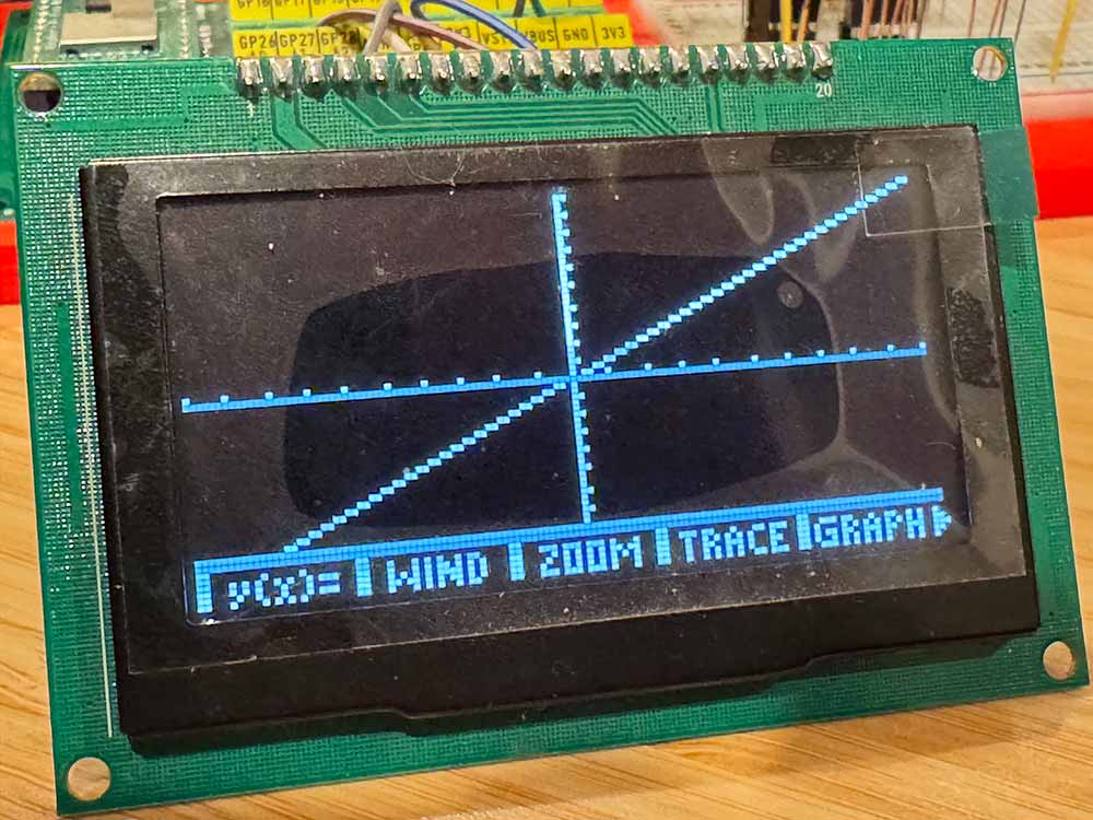 Eventually there were signs of life on the OLED display. With a few more tweaks the TI-86 screen finally appeared. At this point, we have a working prototype.