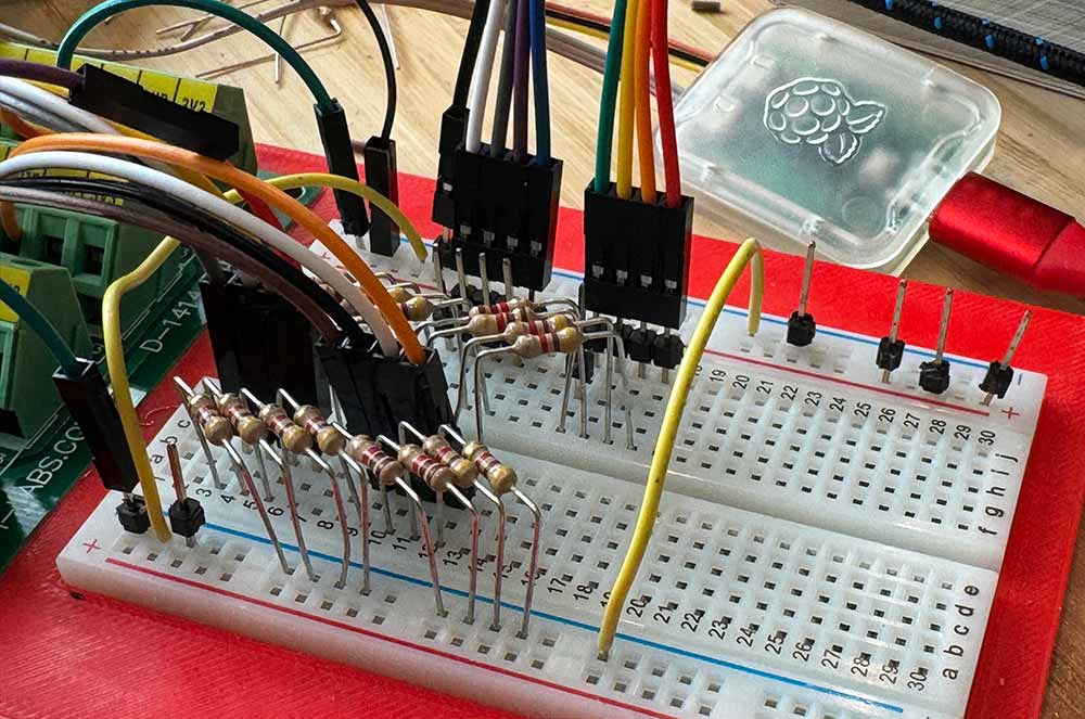 The screen data lines were running at almost 6V. It looks like they tend to run with the battery voltage? Any way you slice it, the voltage is too high for the pins on the Pi Pico. Usually you would throw a level shifter in here to bring ~5V values down to 3.3V. The problems is that most level shifters won’t go above 6V according to their data sheets. We can figure out a permanent problem to that later, but for now we can solve it temporarily with two resistors acting as a voltage divider on each line – just cut the voltage in half and hope the Pico can still see it.