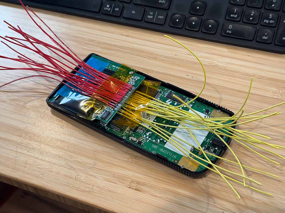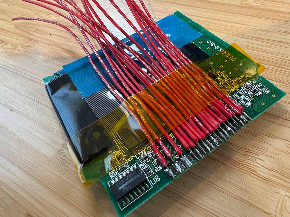 OK. While nobody has 100% cracked the code, we are set up for success. Let’s create a test rig where we can pick up where the above investigations left off. I ordered a $10 TI-86 from eBay that had bad lines on the screen and proceeded to make modifications. Our end goal here is to keep the main board connected to the screen, so we can see what is being displayed, but to break out the connections where we can easily examine the signals with an oscilloscope or digital logic analyzer.