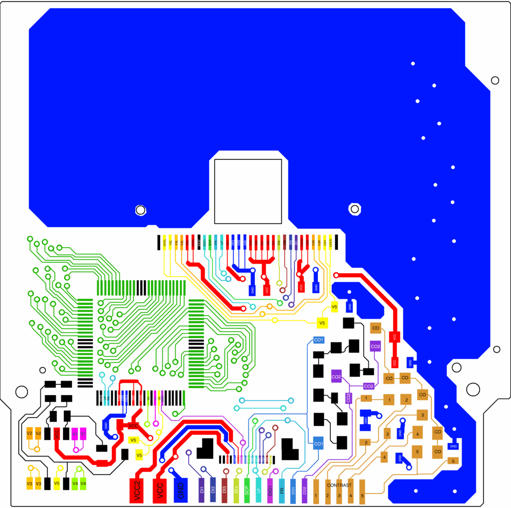 “That’s apparently what the TI-86’s CPU sends to the LCD, very similarly to VGA, with something like hsync to select the next row and vsync to select the first. Thus most LCDs always have essentially two [types of] chips, row drivers and column drivers. Huge LCDs with a lot of pixels have many of these daisychained. They’re often on the ribbon cables that go to the glass. The display driver (the CPU, in this case) typically only interfaces with the first row-driver and first column-driver chips.”