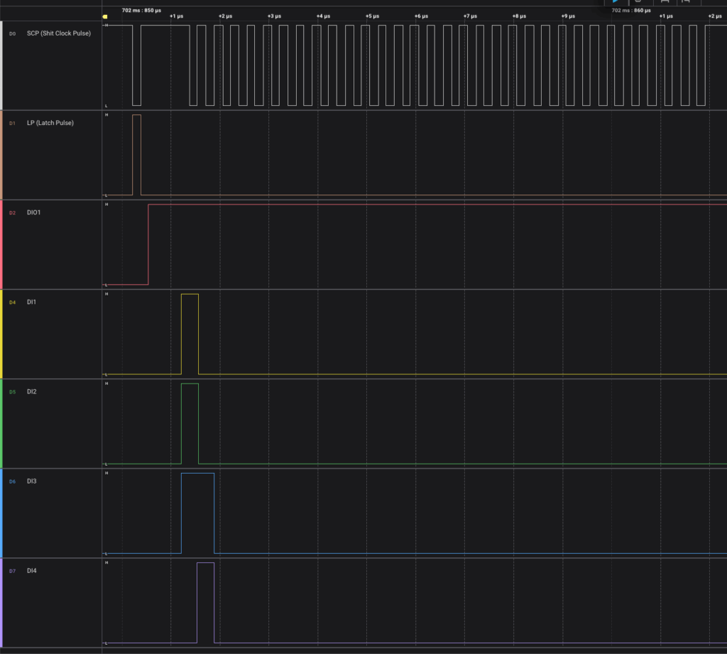 - Shift clock pulse (SCP) goes low and Latch Pulse (LP) goes high to signal a new row